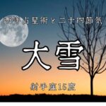 西洋占星術の数え度数では射手座16~30度までが二十四節気「大雪」に相当し、秋の終わりから冬の入り口へ移行する、季節的な変化が大きいタイミングとなります。